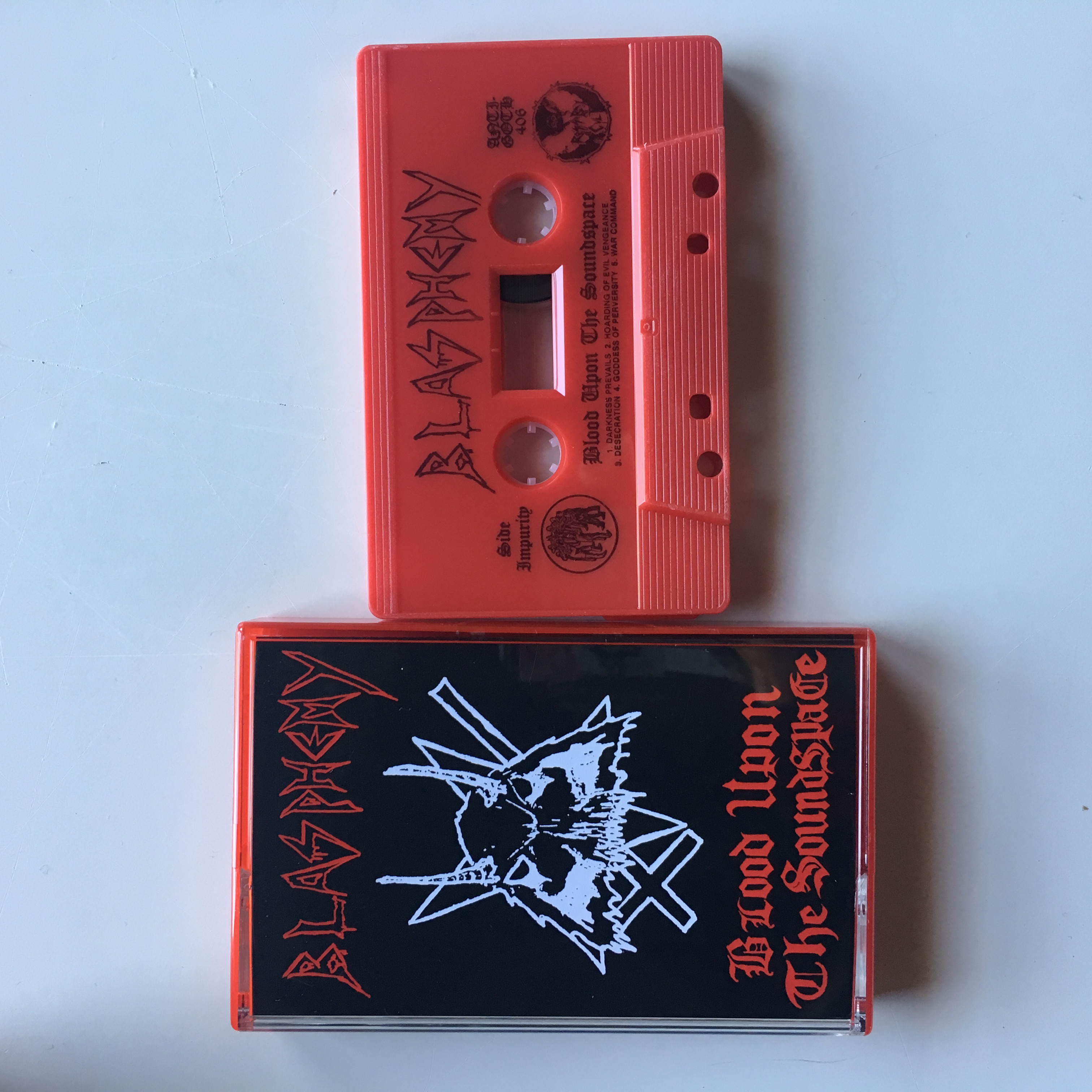 Following the recent reissue campaign, NWN! is honored to present the first official release of a rarely heard 1989 rehearsal recording, Blood Upon the Soundspace. This crude open-air mic recording captures the unvarnished vigor of Blasphemy in a way that the contemporaneous studio recordings cannot. The rehearsal took place in Blasphemy’s practice space sometime following the release of the Blood Upon the Altar demo as the Desecraters were writing material that would later appear on the 1990 debut LP, Fallen Angel of Doom. Four of the five tracks feature songs that would be recorded for the album, with “War Command” being the only exception. The live performance of these tracks in the band’s rehearsal space is devastating and showcases a side of Blasphemy that many have never previously heard. The unified front of the instrumentation—the blunt force of Black Winds’ bass assault, the wicked precision of Black Priest’s rhythm guitar, Black Hearts’ furious drumming—is undeniably powerful. Black Winds’ raw vocals, raspier than on the studio recordings, drive the intensity of the performance, while Caller’s renegade solos are characteristically unhinged and frantic. The band only produced a handful of these rehearsal tapes for distribution to close associates. This version of the recording is taken from a tape Black Winds sent to Metalion (Slayer Magazine) in May of 1989—one of the only known extant copies—and is newly mastered by James Plotkin to enhance the audio where possible. (Note that the first track, “Darkness Prevails,” is noticeably more distorted than the rest of the recording.) To maintain the authenticity of this release, the cover features original artwork created in 1988 by Black Priest and screenshots taken from a video recording at the Blasphemy rehearsal space during the same era.