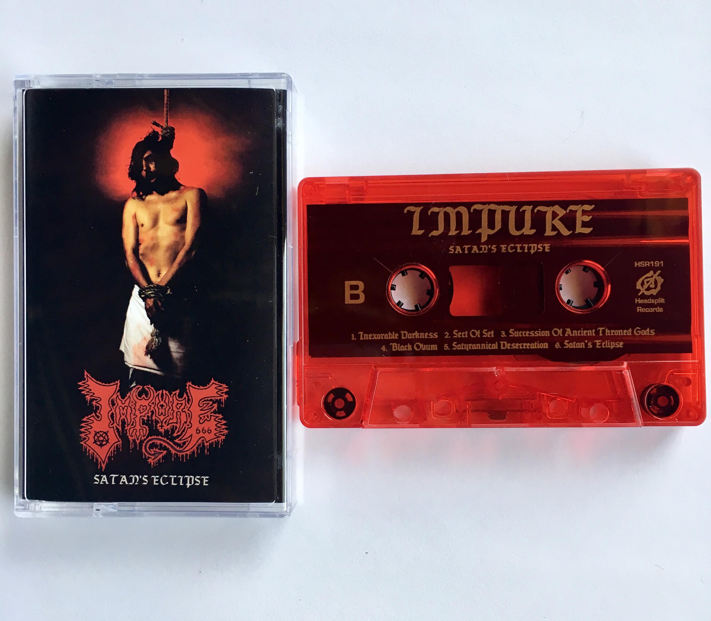 Impure - "Satan's Eclipse" debut full length album. 12 blasphemous hymns to Satan were tracked at Moonlight Mile Studios in Hoboken, New Jersey and produced by Fred Estby (Dismember). SATAN'S ECLIPSE also features unholy contributions from Chuck Keller (Ares Kingdom), Arild Torp (Obliteration, Nekromantheon), Henrik Palm (ex-In Solitude) and Jonathan David Hulten (Tribulation). The duo—HORNED FATHER OF DESECREATION (vocals, drums) & SATYRANNICAL LORD OF ASSAULT (guitars, bass)—started in Saint Louis, Missouri in 2017 and quickly established its cloven hooves in the American black metal circle with the Satan's Eclipse MMXVII demo and self-released "Transfixed In Limbo" single, along with live offenses alongside Varathron, Negative Plane, Malokarpatan, Xibalba Itzaes and OCCVLTA. 2019 is the beginning of a new chapter for IMPURE, starting this summer at the Metal Threat Festival in Chicago, Illinois and Scandinavia Deathfest in Stockholm, Sweden. On the eve of the fullmoon, the light gives way to...SATAN'S ECLIPSE! For fans of Beherit, Archgoat, and Mystifier.