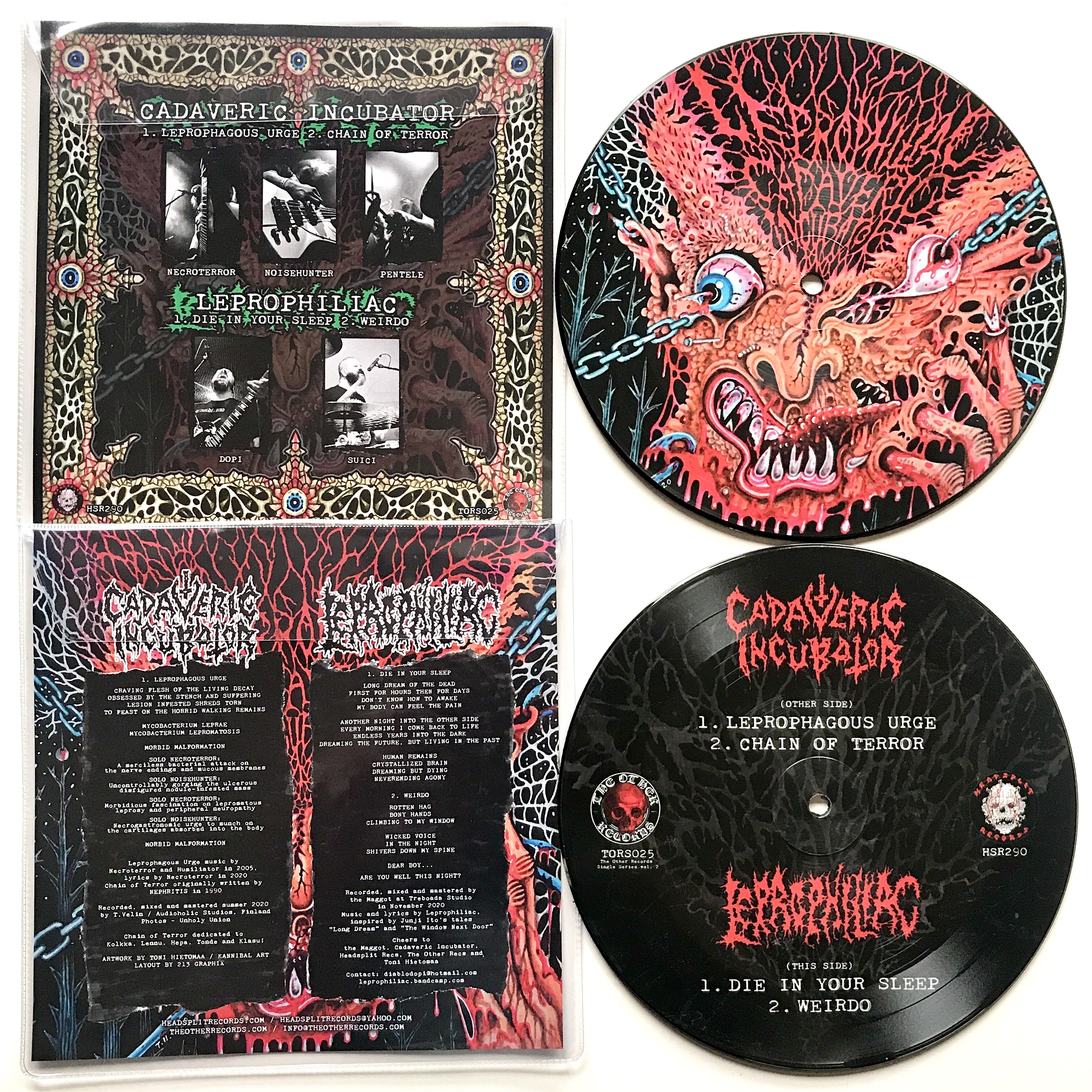 [HSR290] Cadaveric Incubator / Leprophiliac split picture disc 7" out now from Headsplit Records!