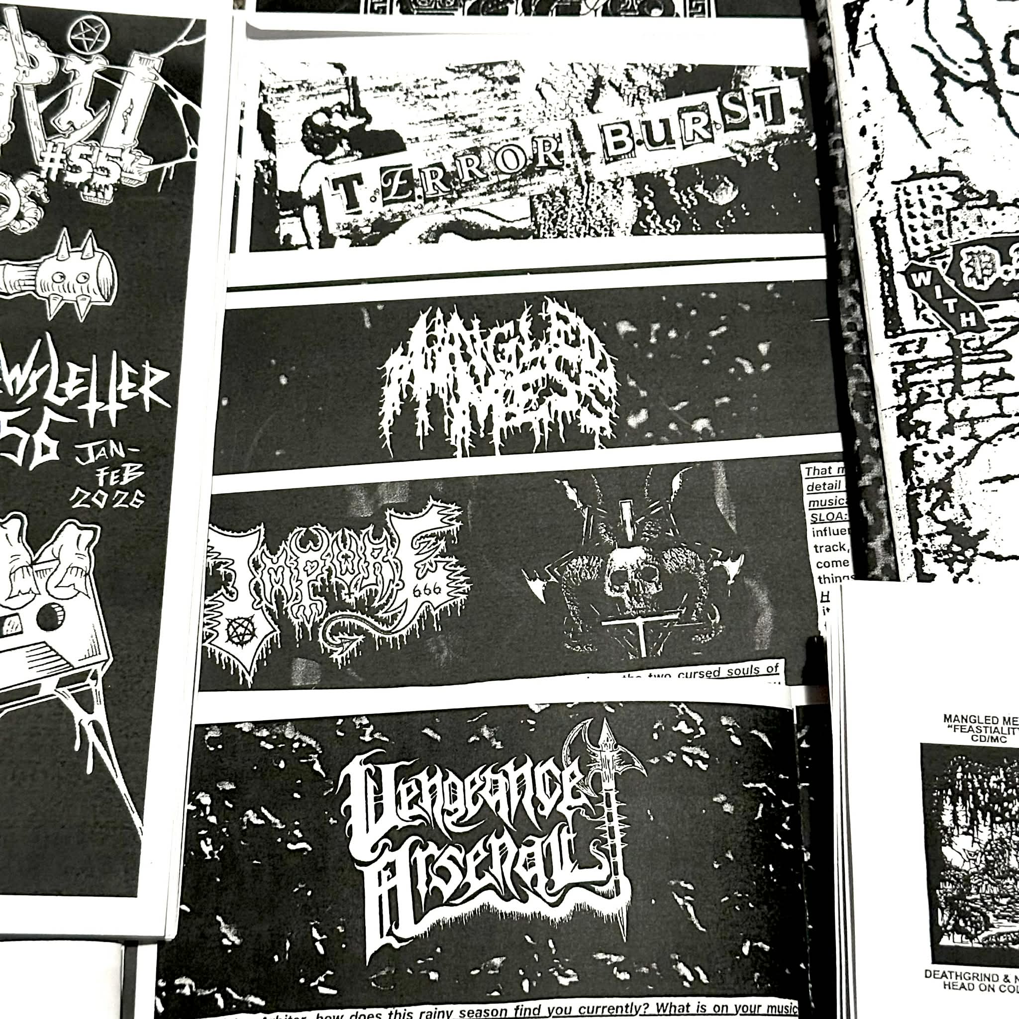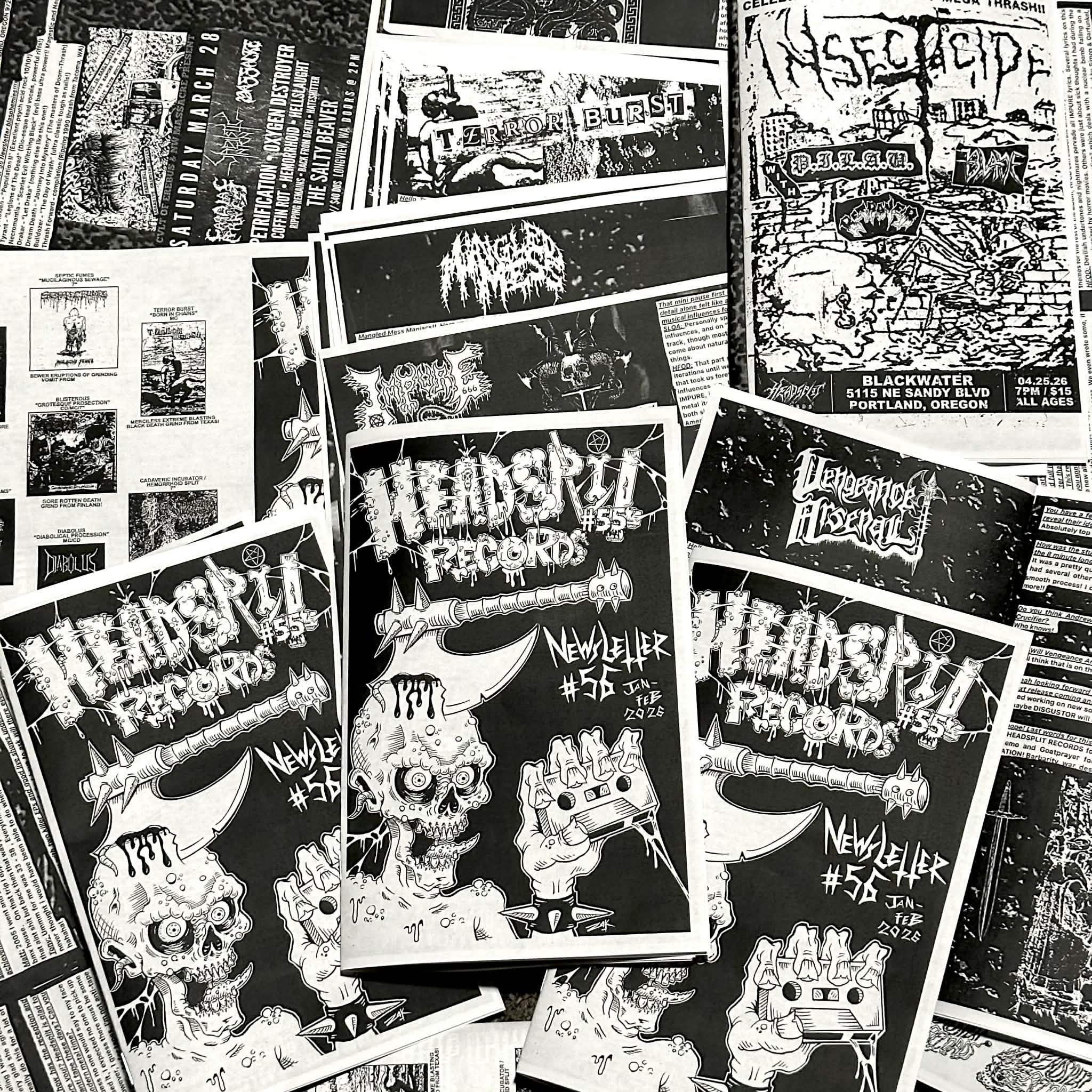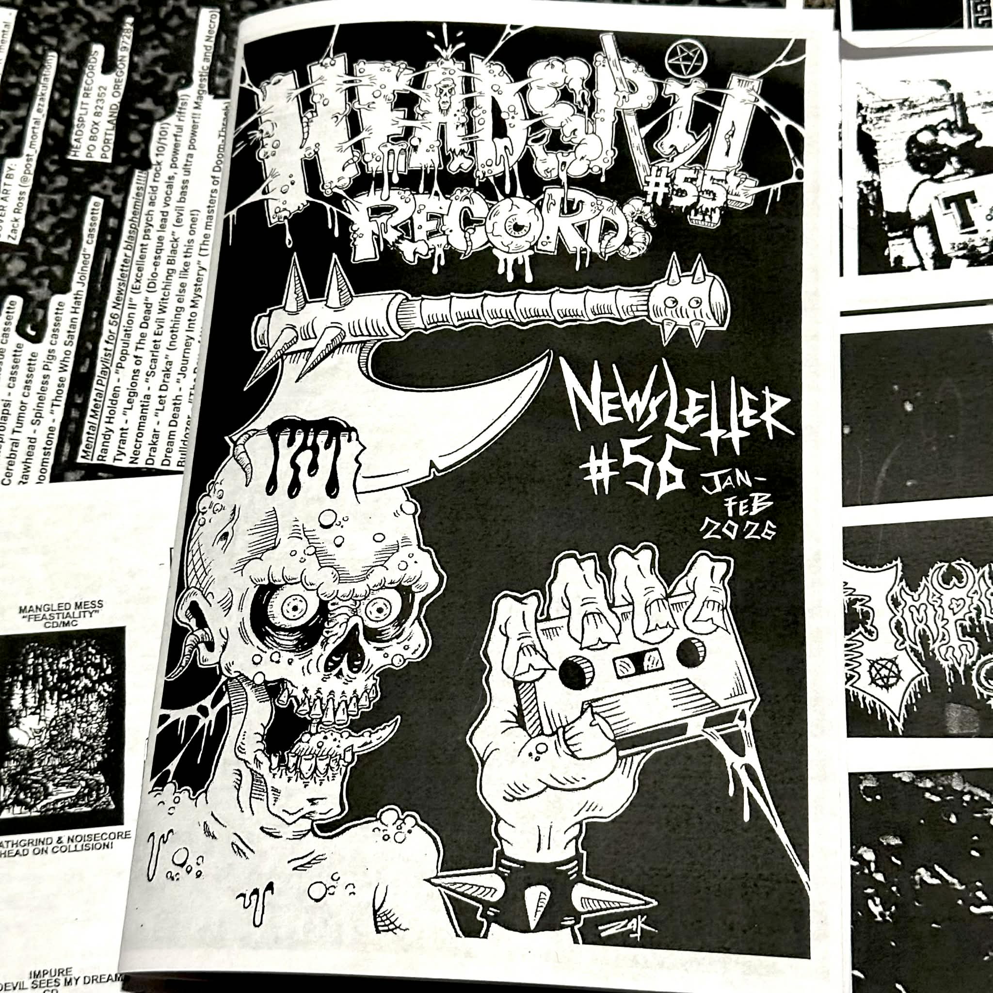 Headsplit Records Newsletter 56 out now for the new year ya filthy animals!!! 16 pages of visual literary agony!!!! Interviews with Impure, Mangled Mess, Terror Burst and Vengeance Arsenal!!!! Reviews, flyers, and more metallic mayhem included in the pages of damnation! Cover artwork by Zack Ross